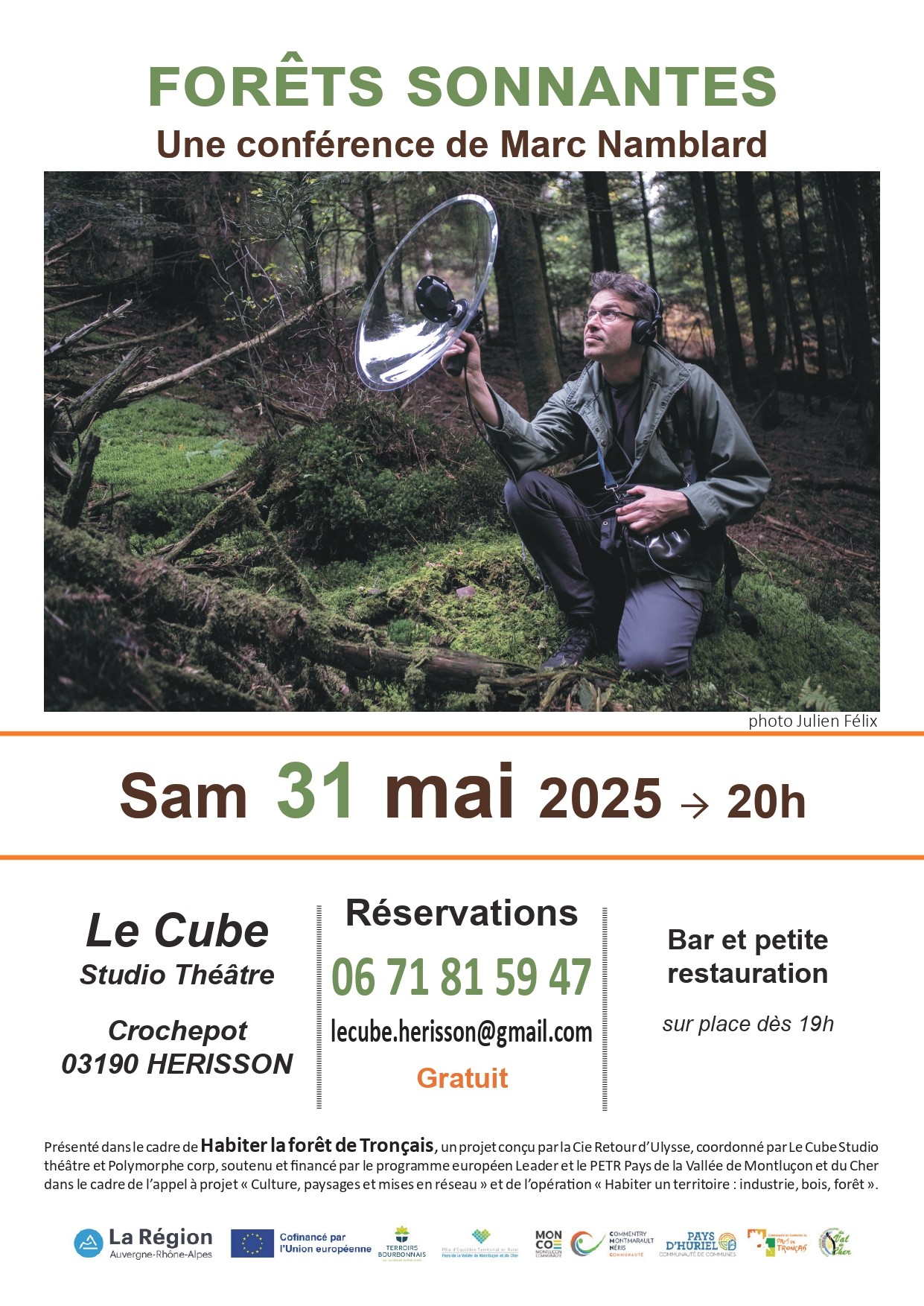 Le Cube studio théâtre à Hérisson en collaboration avec Polymorphe corp. à Cérilly proposent le projet Habiter la forêt de Tronçais, en réponse à l’appel à projet “Culture, Paysages et mise en réseau” et de l’opération « Habiter un territoire : industrie, bois, forêt » lancé par le Pôle d'équilibre territorial rural de la Vallée de Montluçon et du Cher. Ce projet reposera sur l’accueil de la compagnie Retour d’Ulysse (Aveyron) sur deux temps résidences de territoire en juin et juillet 2025, afin de concevoir un projet à partir de ce milieu forestier très riche, patrimoine vivant incomparable qui cristallise les enjeux écologiques, culturels et sociaux de notre territoire.